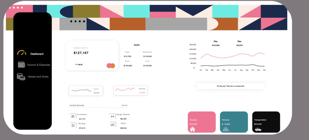 A complete snapshot of financial health at a glance — including available balance, total assets, and category spending.