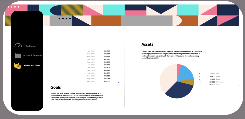 Assets & Goals Page: Pie charts and line visuals showing asset distribution (land, gold, warehouse, bonds) and goal progress.