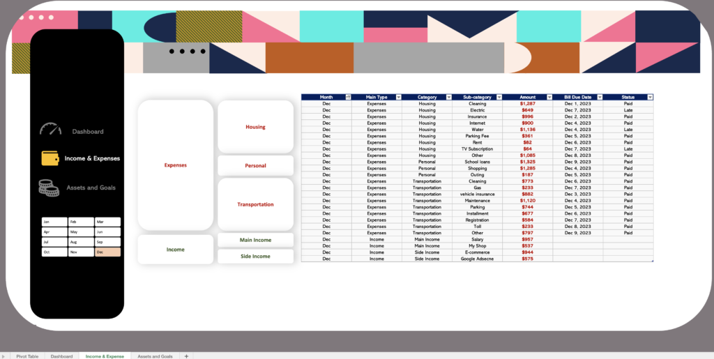 Income & Expenses Page: Month-wise breakdown of transactions, showing paid vs. late bills and income source contributions.