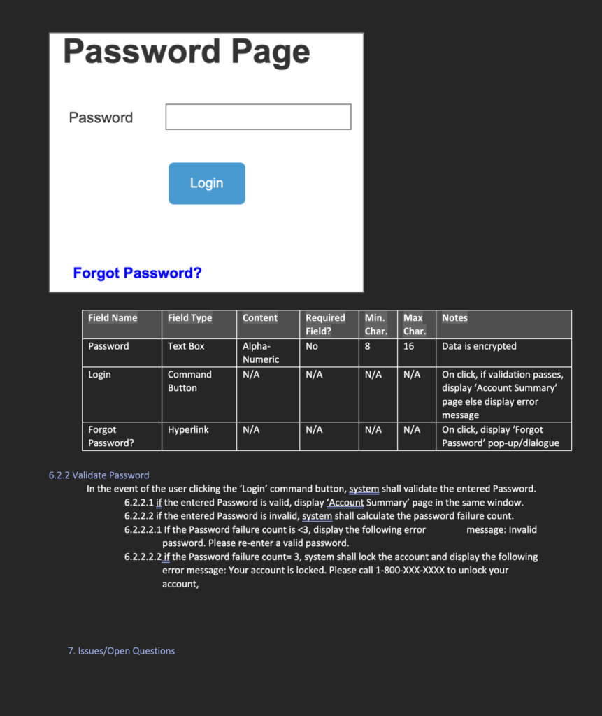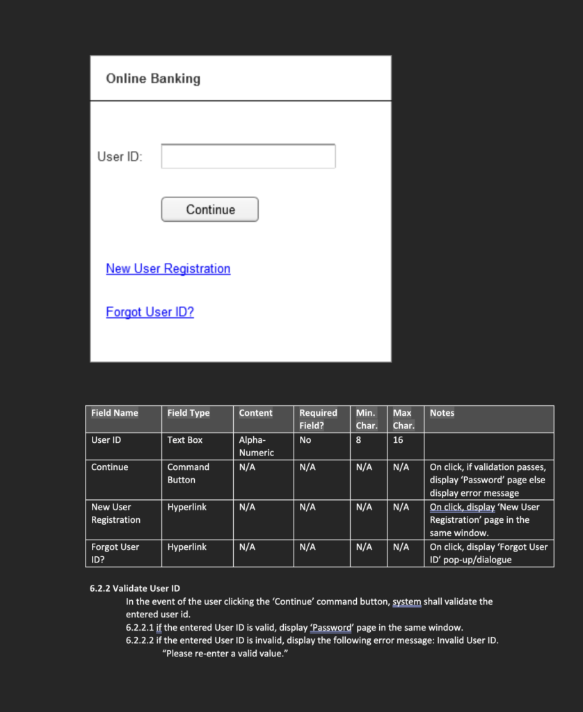 Each feature is described with detailed step-by-step functional flows, including data fields, user actions, validations, and error handling. This ensures that developers, testers, and other stakeholders have a clear blueprint for implementation. Wireframes and interface descriptions accompany the requirements to illustrate how each page and action will appear to the user.