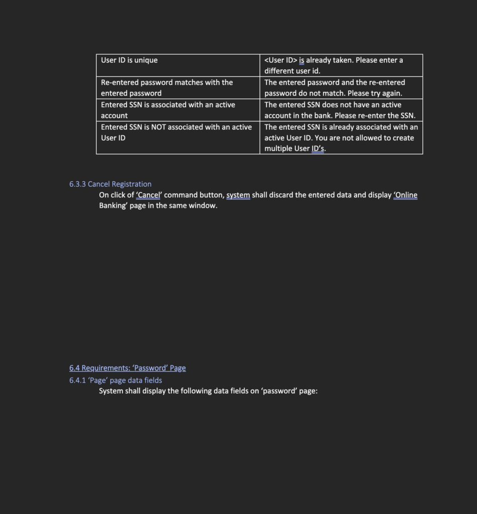 All functional requirements have been carefully documented, including user interactions, validations, error handling, and navigation flows, ensuring clarity and minimizing ambiguity during development. With adherence to security, performance, usability, and compliance standards, this Online Banking system will deliver a robust, scalable, and reliable digital banking experience for customers.