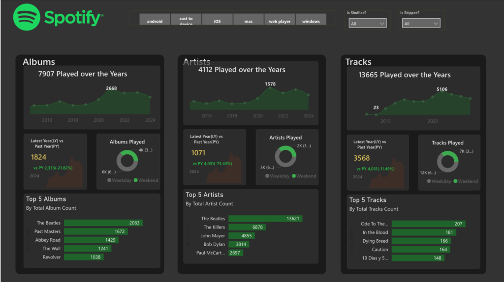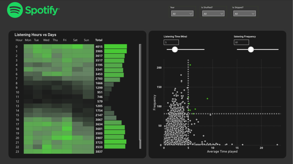 The dashboard provided a comprehensive and dynamic view of Spotify listening behavior, delivering insights such as: