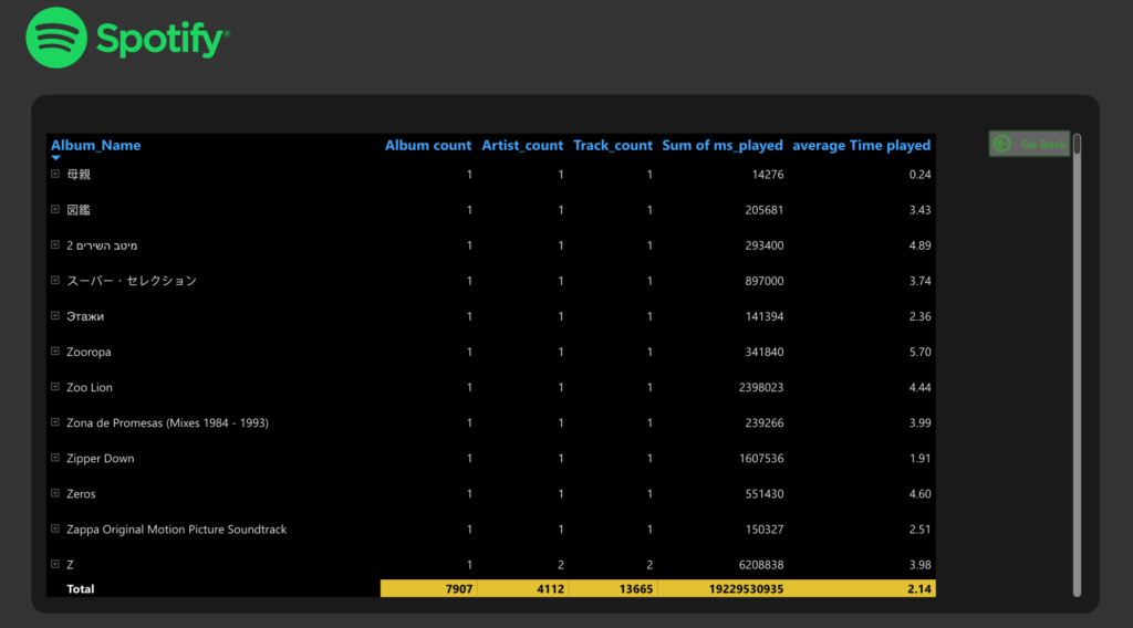 Designed a multi-page Power BI dashboard with dedicated sections for Albums, Artists, and Tracks.