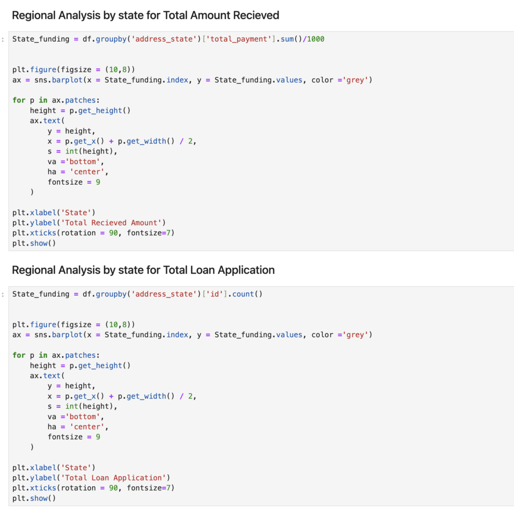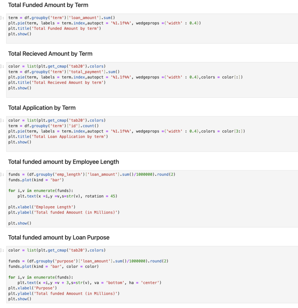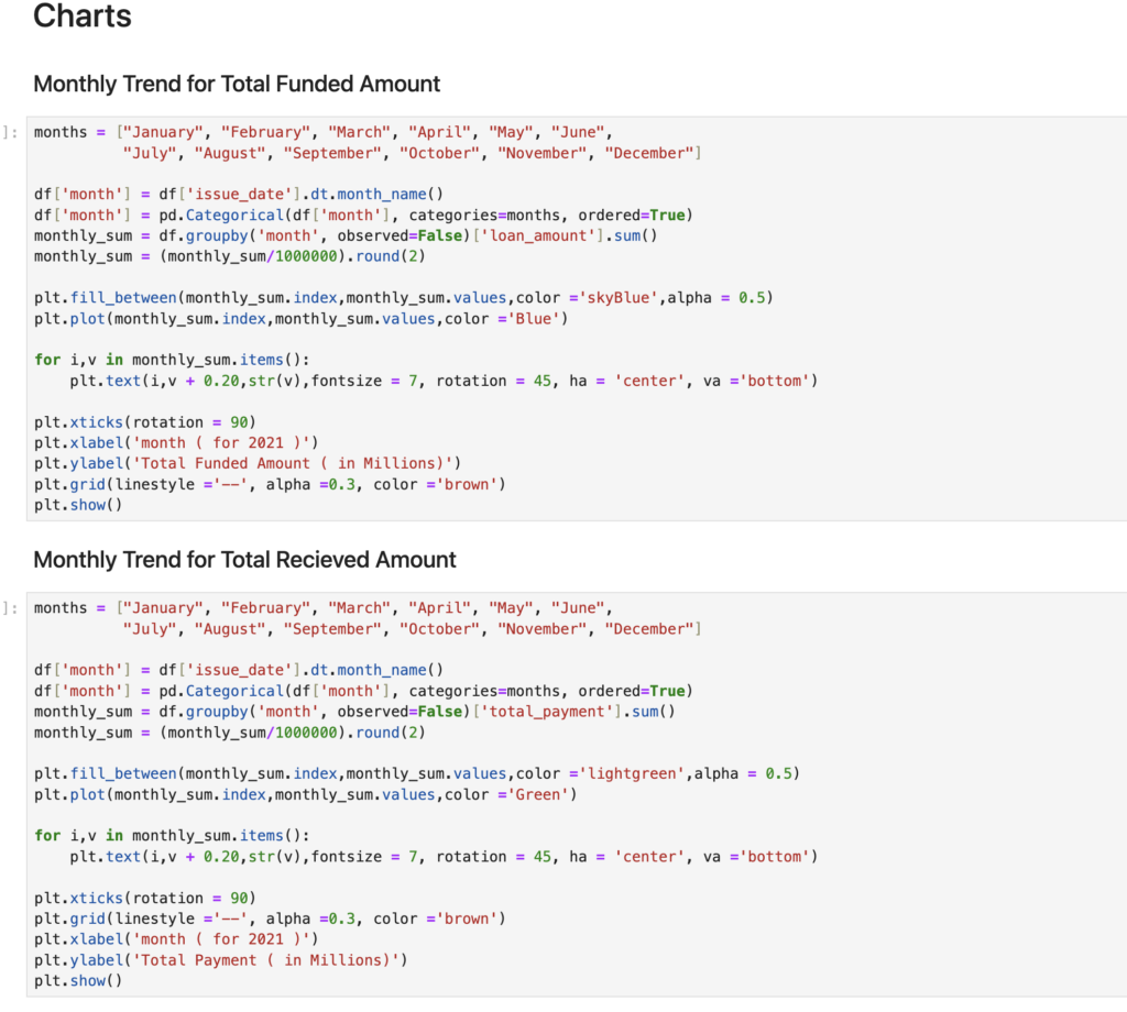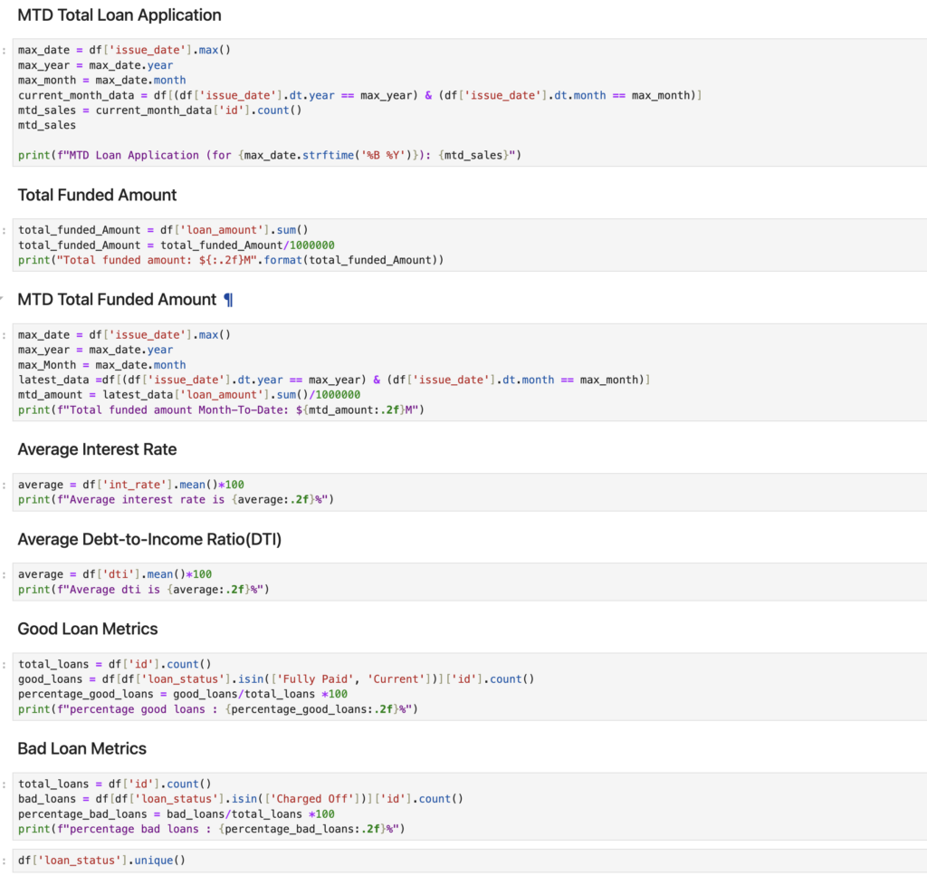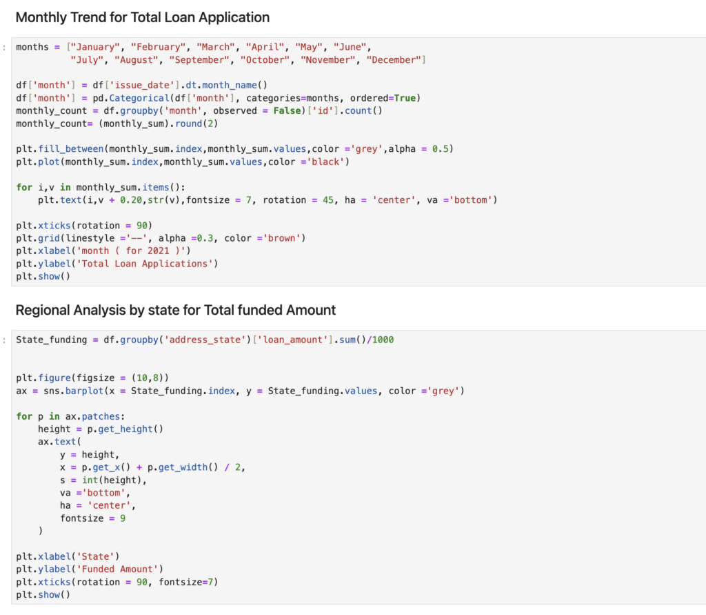 As part of the initial phase of the analysis, I began by calculating various Key Performance Indicators (KPIs) related to loan applications and funded amounts. This process was executed within a Jupyter Notebook environment, which allows for interactive code execution, real-time analysis, and the visualization of results, making it an essential tool for financial analysis and reporting.