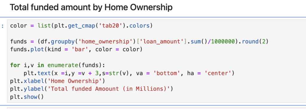 A bar chart is generated where each bar represents a different home ownership status, and the height of the bar indicates the total loan amount for each group.