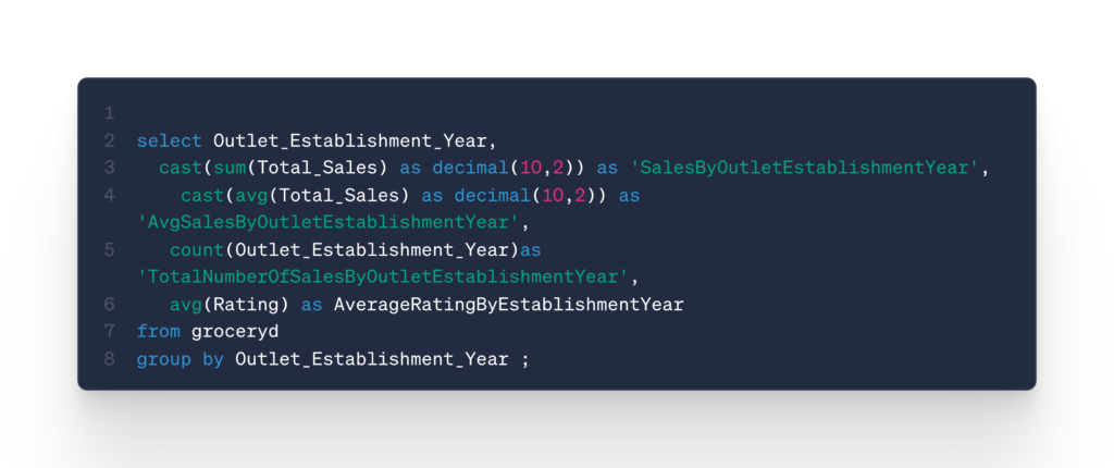This task involves calculating several key metrics grouped by Outlet Establishment Year: