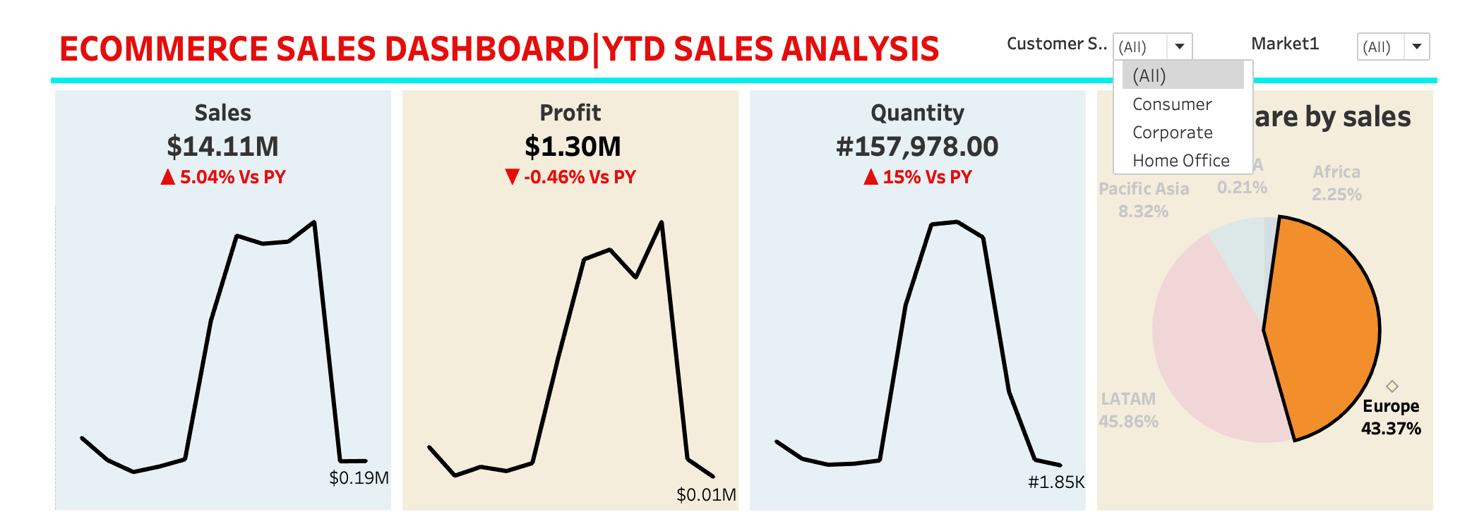 The company needed a data-driven performance monitoring tool to evaluate year-to-date (YTD) sales, profit, and quantity trends across global markets and product categories.