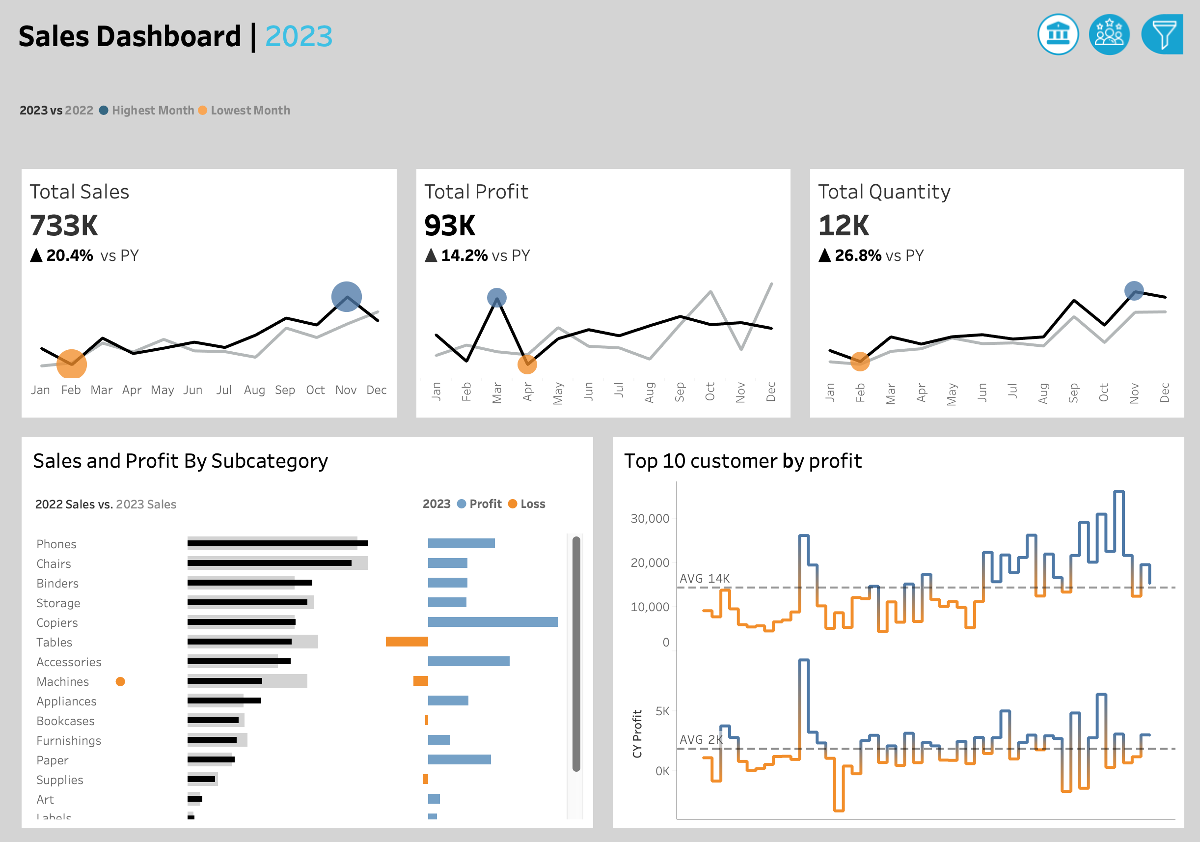 Total sales reached $733K, marking a 20.4% increase vs 2022, while total profit grew by 14.2% to $93K.