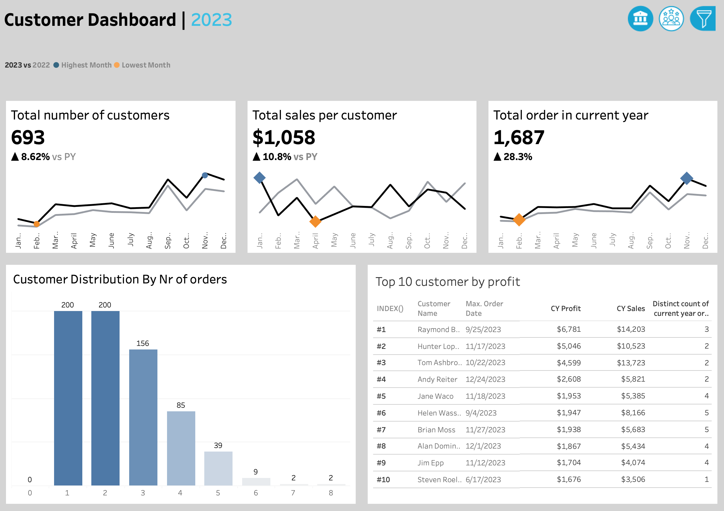 Customer Dashboard (2023): Highlighting 693 customers (+8.6%), Average Sales per Customer $1,058 (+10.8%), Orders 1,687 (+28.3%).